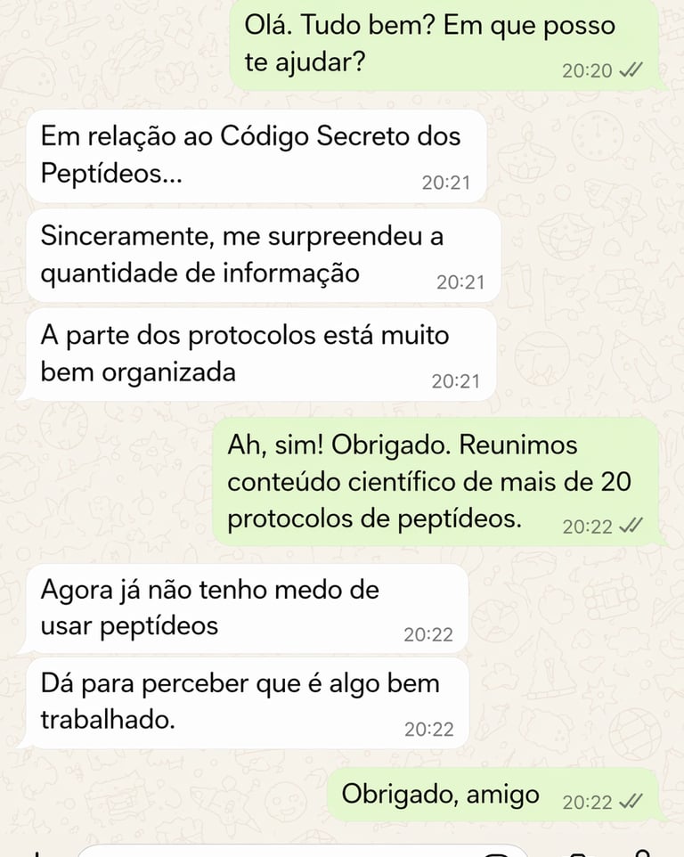 O Código Secreto dos Peptídeos é um material completo que reúne, de forma simples e prática, tudo o que você precisa saber para utilizar peptídeos com estratégia, segurança e foco em resultados reais.